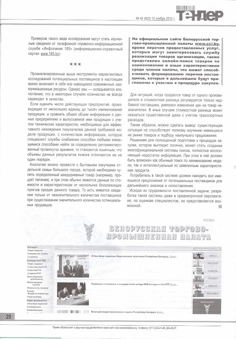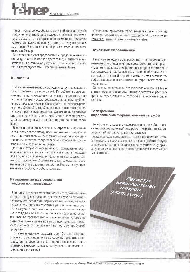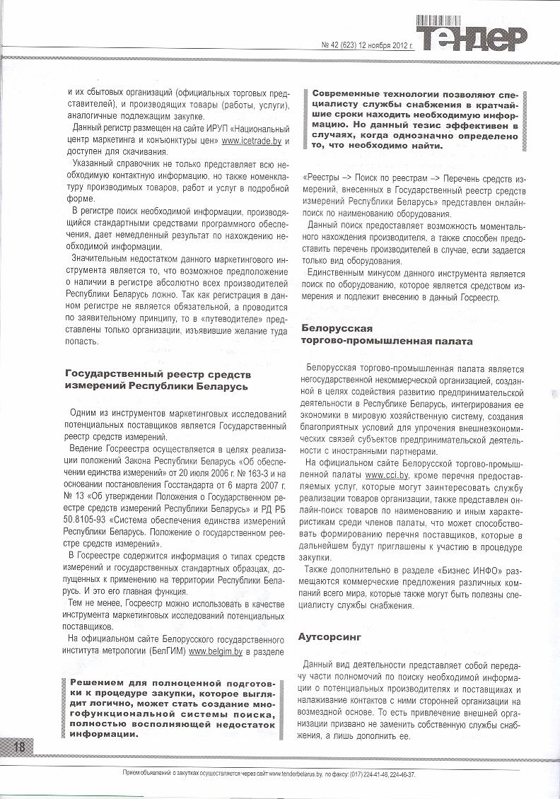 В статье представлены источники и способы нахождения необходимой информации, достаточной для формирования перечня поставщиков, которые в дальнейшем будут приглашены к участию в процедуре закупки. В частности, рассматриваются Интернет-поиск, Интернет-справочники, Регистр производителей товаров и их сбытовых организаций, Государственный реестр средств измерений Республики Беларусь, Белорусская торгово-промышленная палата, Аутсорсинг, Выставки, Размещение на нескольких тендерных площадках, Печатные справочники, Телефонная справочно-информационная служба.