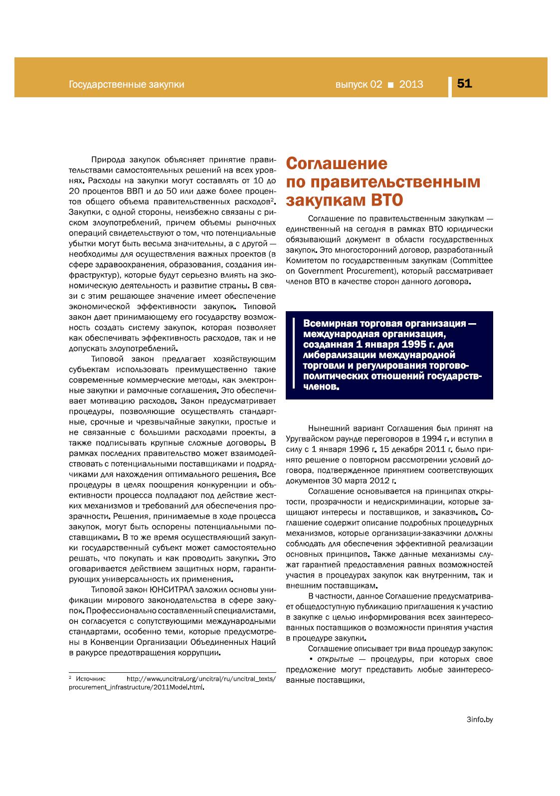 В статье представлен обзор Типового закона ЮНСИТРАЛ о публичных закупках, Соглашения по правительственным закупкам ВТО, обзор деятельности Международной торговой палаты, а также принципы разработки, этапы создания и преимущества использования единой международной системы закупок.