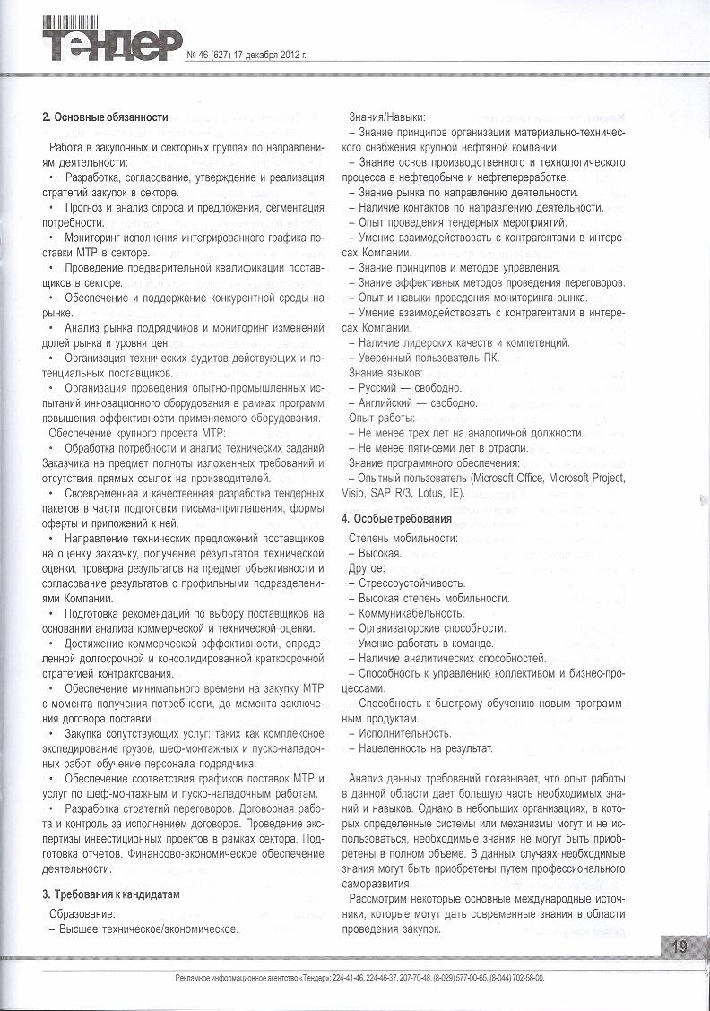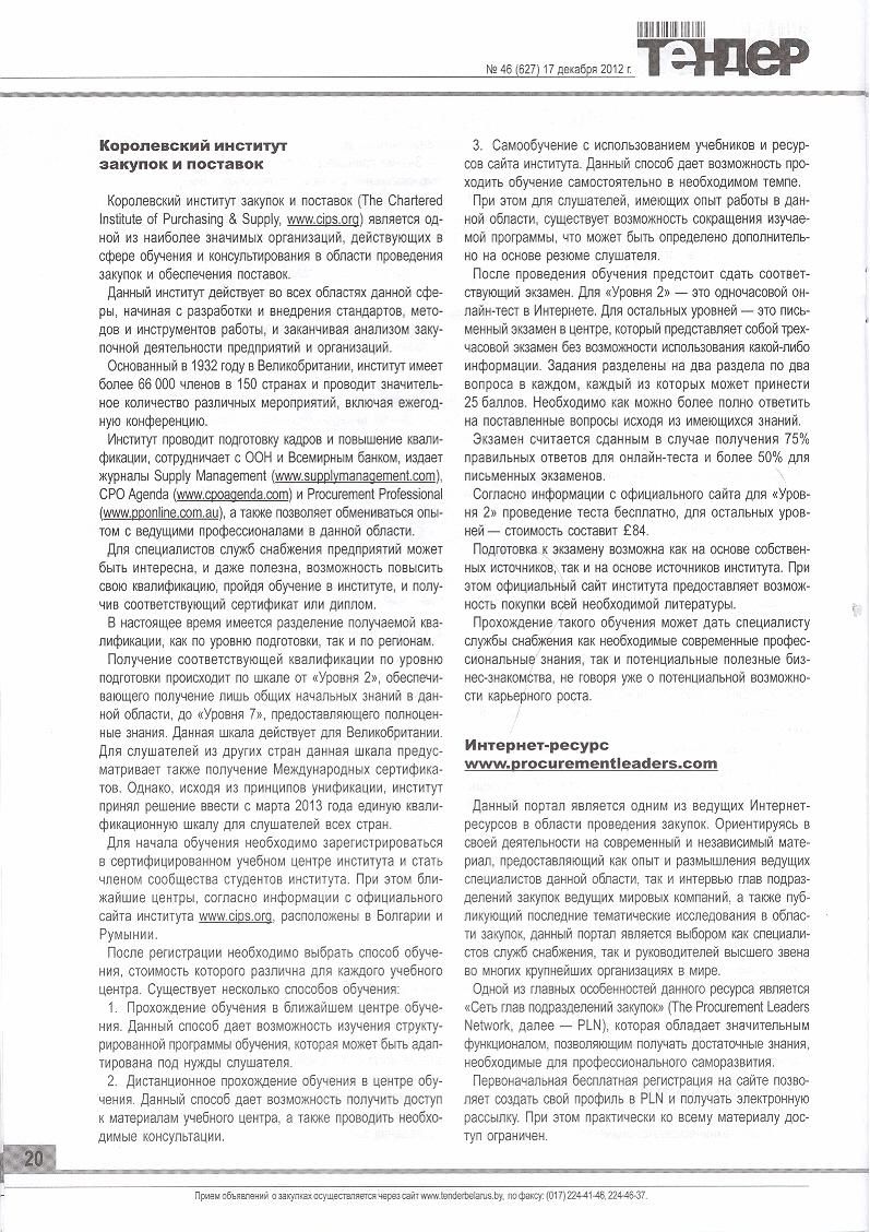 В статье рассмотрены современные требования к специалисту службы снабжения, а также представлена информация о некоторых основных международных источниках, которые могут дать современные знания в области проведения закупок. В частности, рассматривается Королевский институт закупок и поставок (The Chartered Institute of Purchasing & Supply, www.cips.org), который является одной из наиболее значимых организаций, действующих в сфере обучения и консультирования в области проведения закупок и обеспечения поставок. Также рассматривается один из ведущих Интернет – ресурсов в области проведения закупок www.procurementleaders.com и премия The Procurement Leaders Awards 2013 (www.awards.procurementleaders.com), которой награждают индивидуальных лиц, команды и компании, которые внесли выдающийся вклад в область закупок в течение последнего года.