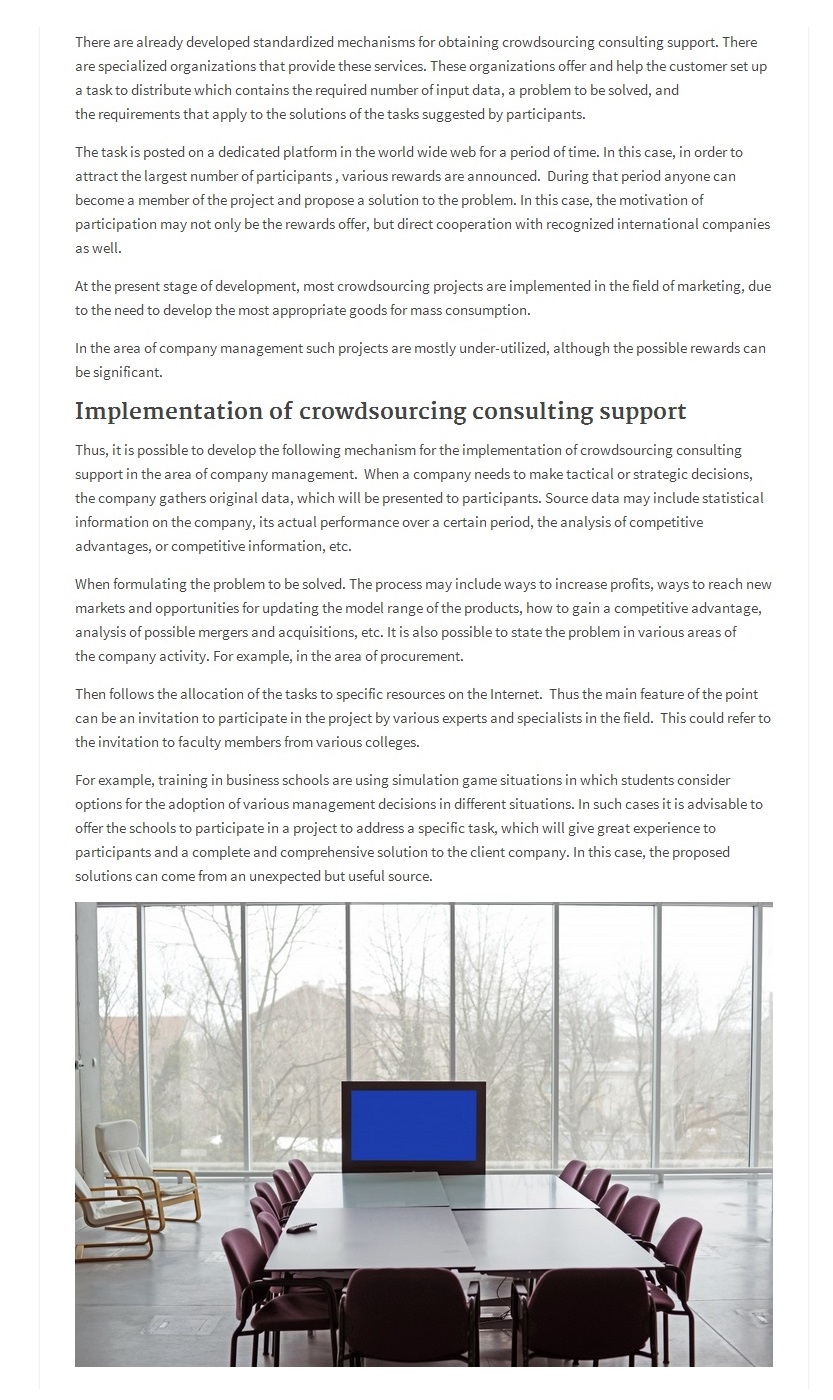 The article proposes a crowdsourcing model of company management with a description of the initial stages of task development for crowdsourcing project consulting support, task forming for the project on the Internet, proposed solutions evaluating to the possibility of company using. It also describes the advantages and disadvantages of this model and also a technique of selection of useful solutions.